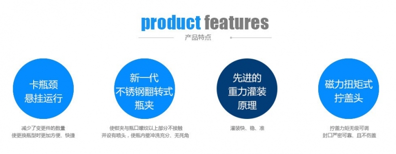 矿泉水灌装机采用卡瓶颈悬挂运行工态设计,从而使瓶在高速运行状态下平稳、可靠,同时大大减少了变更件的数量使更换瓶型时更加方便、快捷。还采用新一代不锈钢翻转式瓶夹, 使钳夹与瓶口螺纹以上部分不接触,并设有喷头,使瓶内壁冲洗充分、无死角。还有先进的重力灌装原理, 灌装快、稳、准!磁力扭矩式拧盖头,实现抓盖、拧盖,让拧盖力矩无级可调, 封口严密可靠、且不伤盖。