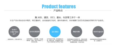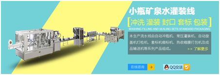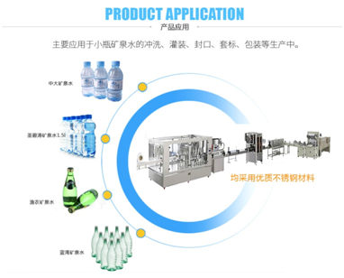 小瓶矿泉水灌装线由自动冲瓶机、常压灌装机、自动旋盖机灯检机、套标机缩标机、热收缩膜打包机及成品输送机等系列产品组成。小瓶矿泉水灌装线冲洗、灌装、封口、套标、收缩包装等主要关键部位均采用优质不锈钢材料制成,具有工艺先进、系统完善、性能可靠、使用方便等特点。