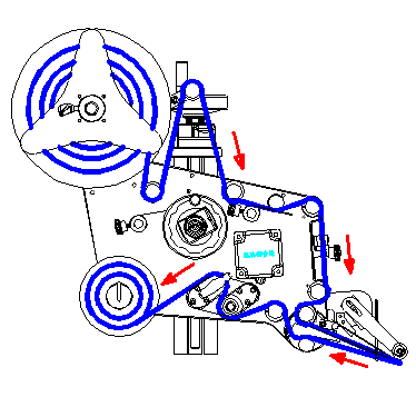 绕标签操作:扭松三角形料盘上的可调把手,把三角形料盘取出;按图示出标方向,把标签料卷装入,再把三角形料盘套上并装好扭紧;按顺时针方向,把牵引机构上的T字把手约扭半圈,牵引两轴松开间隔,然后把两处压标锰片也松开;按图示红色箭头方向把标签绕好(注意整个标带尽量保证平行不偏斜),然后把压标锰片轻压标带,再把牵引上T字把手顺时针扭约半圈,感觉压紧落位即可,绕标完成。