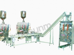 袋中袋包装机主要是完成将包装好的小袋产品按要求整齐的装入大袋编织袋、缝包输出的全自动包装过程。由称量制袋包装机组(一组或多组)、小袋输送整 形设备、小袋计数填充机构、全自动大袋填充设备、成品输送设备等组成。能自动完成散装物料(10~500克颗粒、粉末、液体)的称量,制袋、填充、封口、 小袋输出、整形、计数、制大袋、封口等工作。从而实现了散装物料小包装到编织袋包装的全自动化作业,节约了人力、物力及财力的投入,为客户减少生产成本, 也提高了生产效率。该机组常用于洗衣粉、食盐、种子、奶粉等粉状、颗粒物料的包装,是各大公司实现二次袋中袋包装全自动化的首选机器,广泛用于食品、制 药、调味品、化工等行业。 袋中袋包装机性能特点: