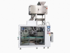 双工位六面体真空包装机组可实现全自动上料、称重、上袋、充填、整形、抽真空、封口,成品输送于一体,将散放物料包装成为具有高附加值得定重成型的包装,包装速度快,运行稳定,该机组广泛应用于大米杂粮等谷物类产品的真空包装使用预制袋,方便小批量生产,袋型美观,密封效果好,便于装盒,装箱或者直接零售。它由全自动快速双头称、给袋式真空机组以及成品输送机等组成,适合多种规格预制袋
