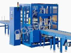 此款产品针对建筑建材行业所使用的夹芯板、保温板、石膏板等板材设计,能够自动放置底部垫块,并将其与产品货物包装在一起,方便叉车转运货物。降低工人劳动强度,提高工作效率并且减少包装费用。